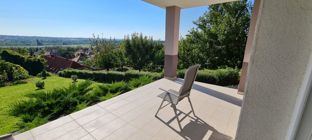 Nyugodt, zöld környezet, panorámás kilátás a városra és a természetre.