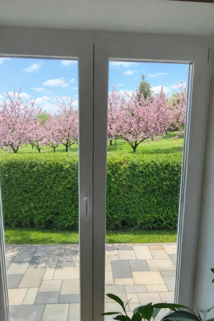 A hálószoba ablaka délre néz. Közvetlenül az ablakok előtt egy gyönyörű gyümölcsöskert terül el. Tavasszal, amikor a barack- és sárgabarackfák virágba borulnak, a látvány valóban lenyűgöző.