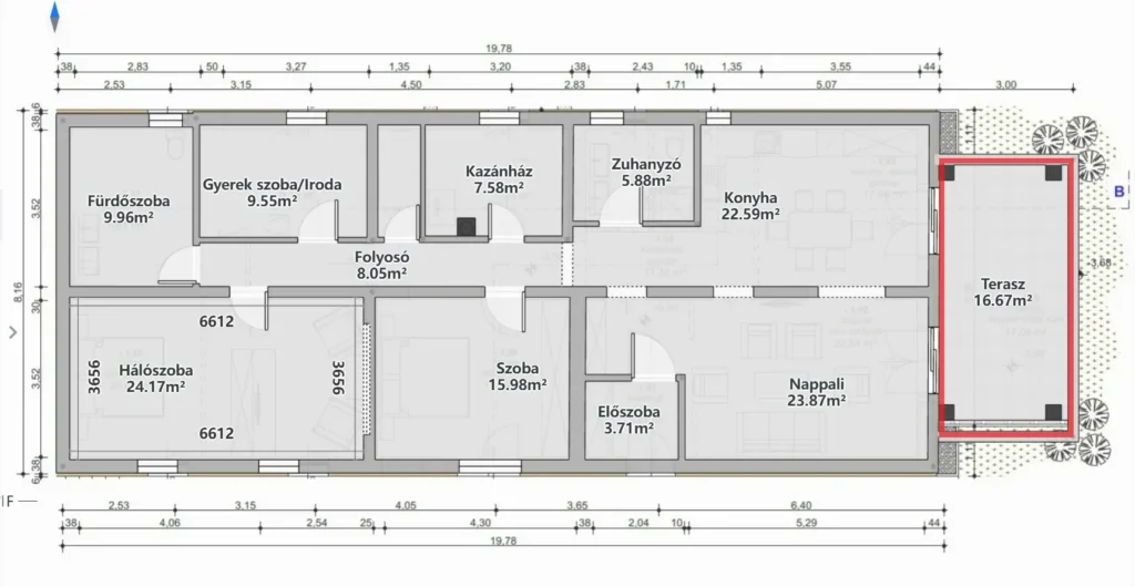 Teraszunk meleg napfénnyel és lágy szellővel hívogat a kikapcsolódásra, tökéletes a reggeli kávéhoz vagy az esti beszélgetéshez.